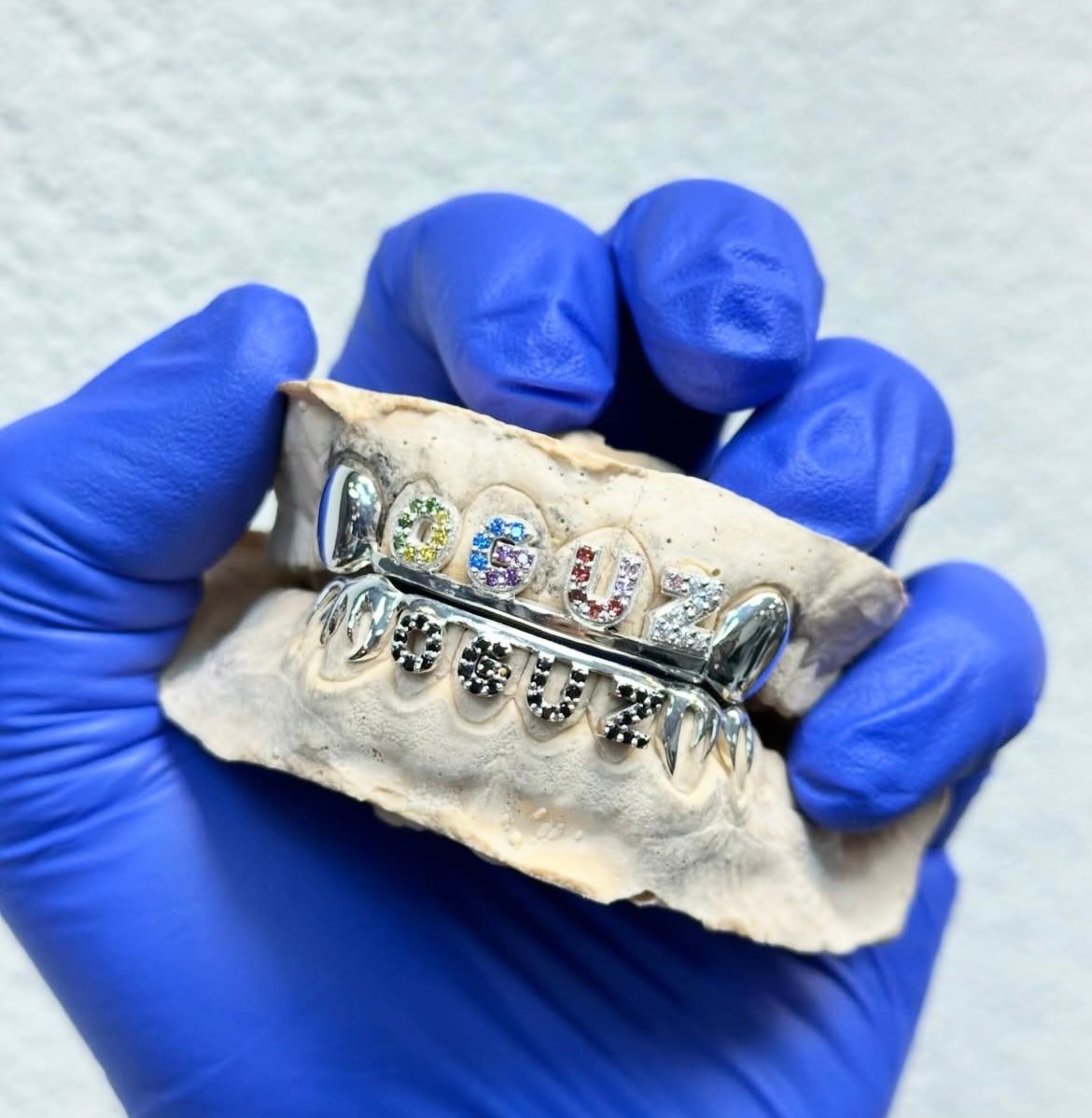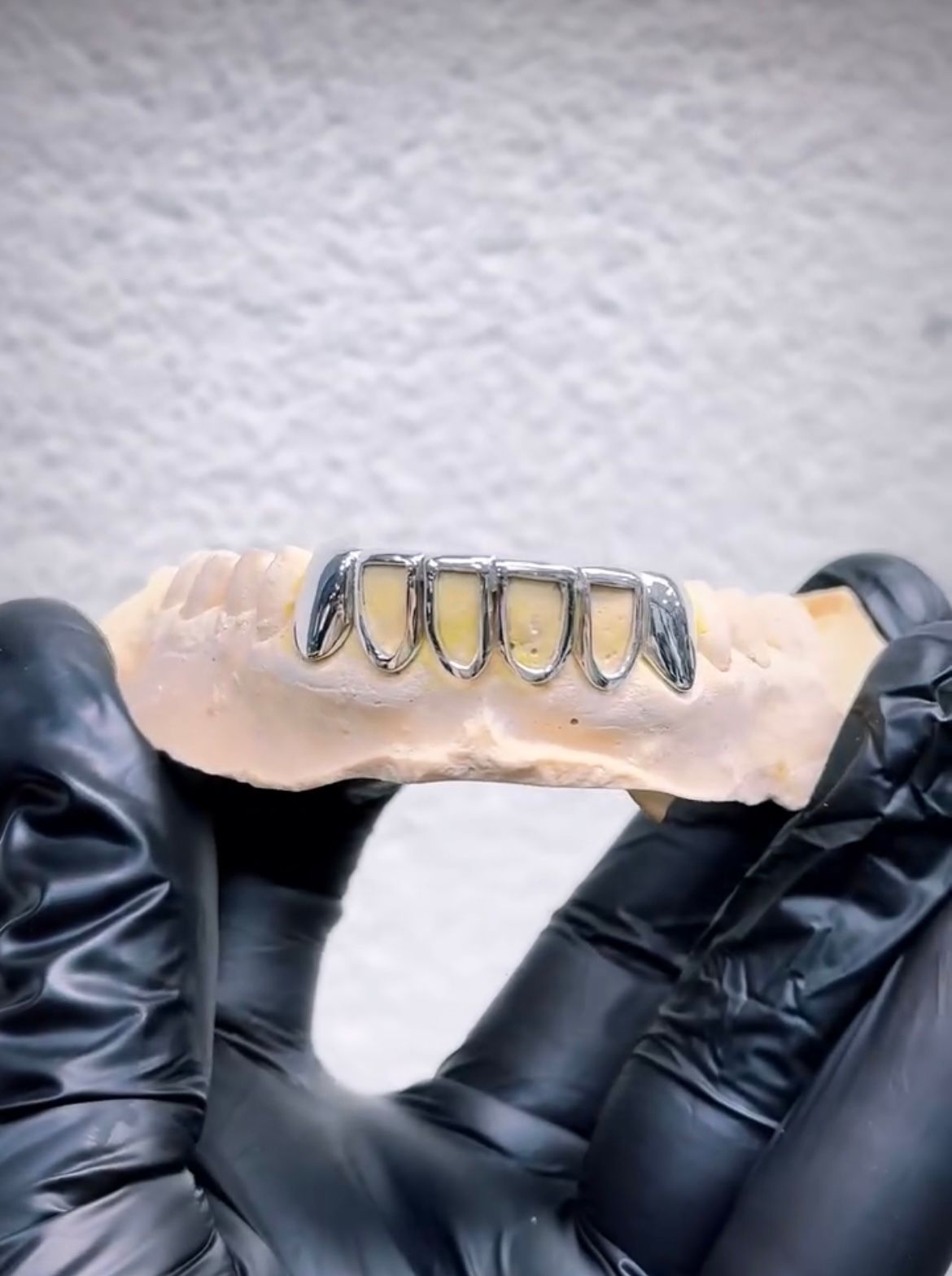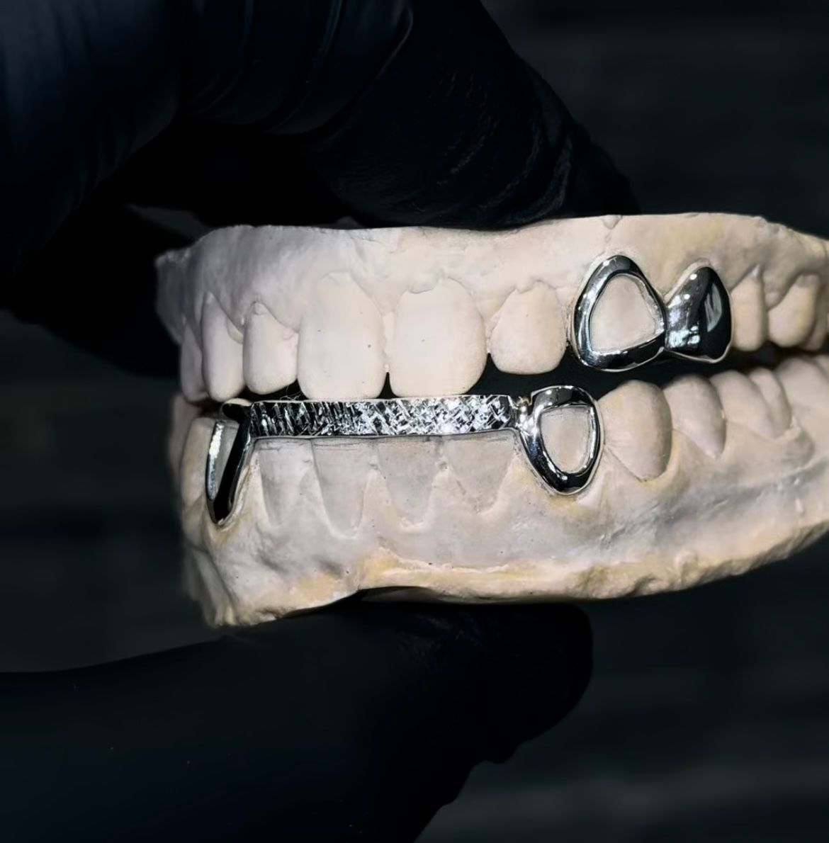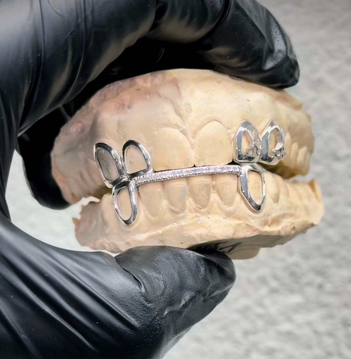 Grillz zijn aan eensluitende tanden, dus bijvoorbeeld 2 tanden naast elkaar die verbonden zijn of een top 12-piece.