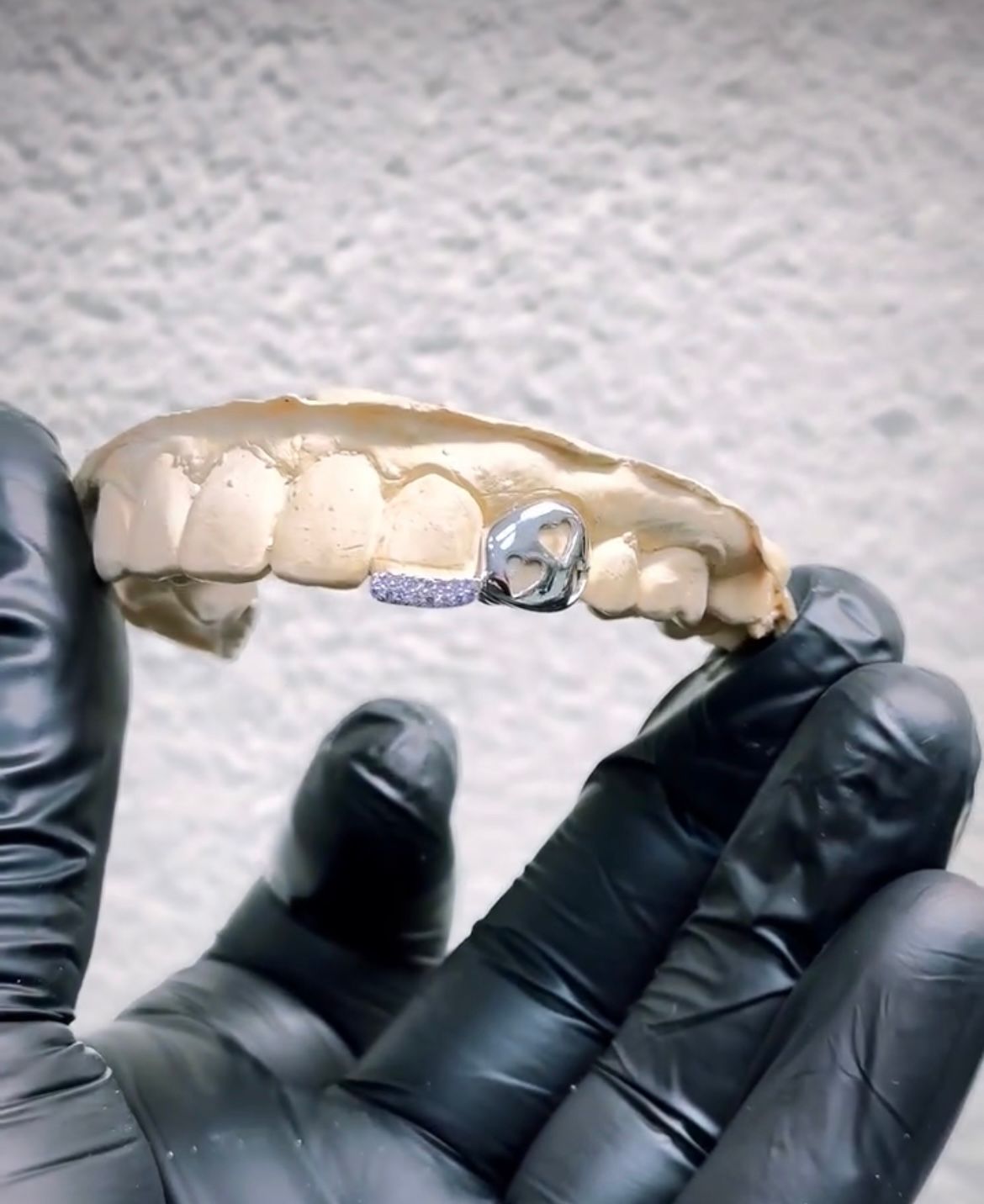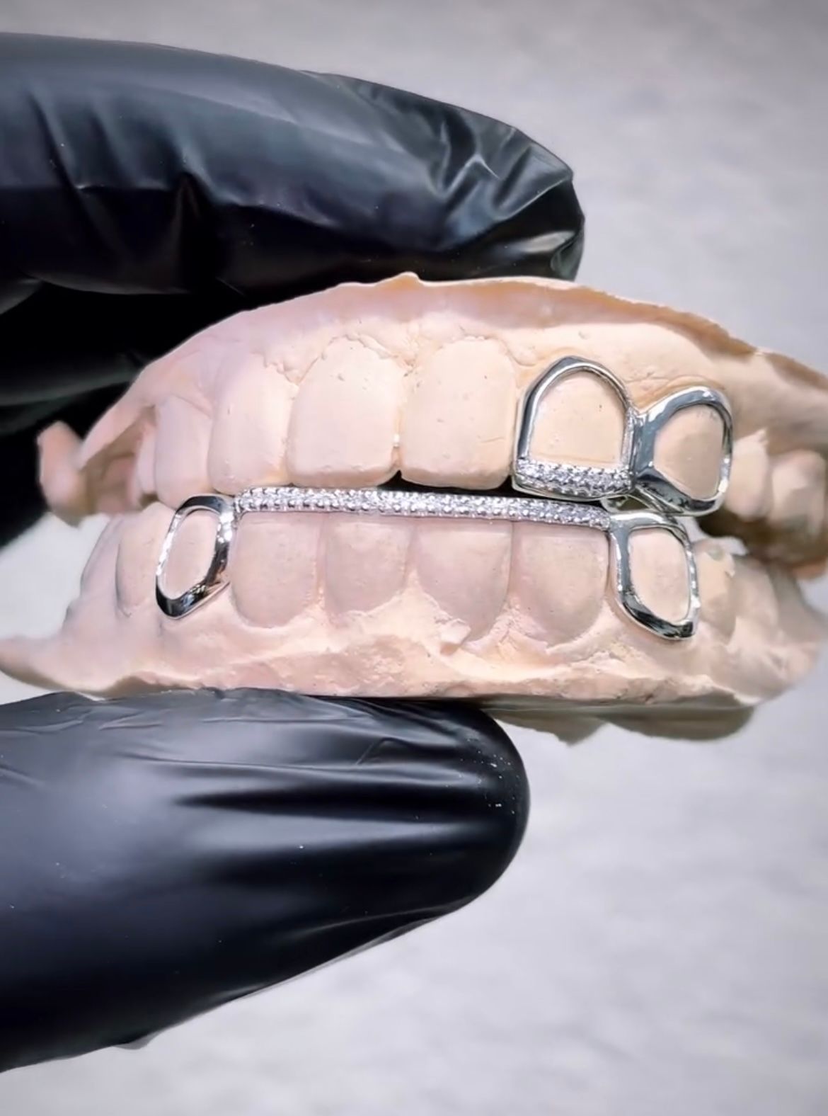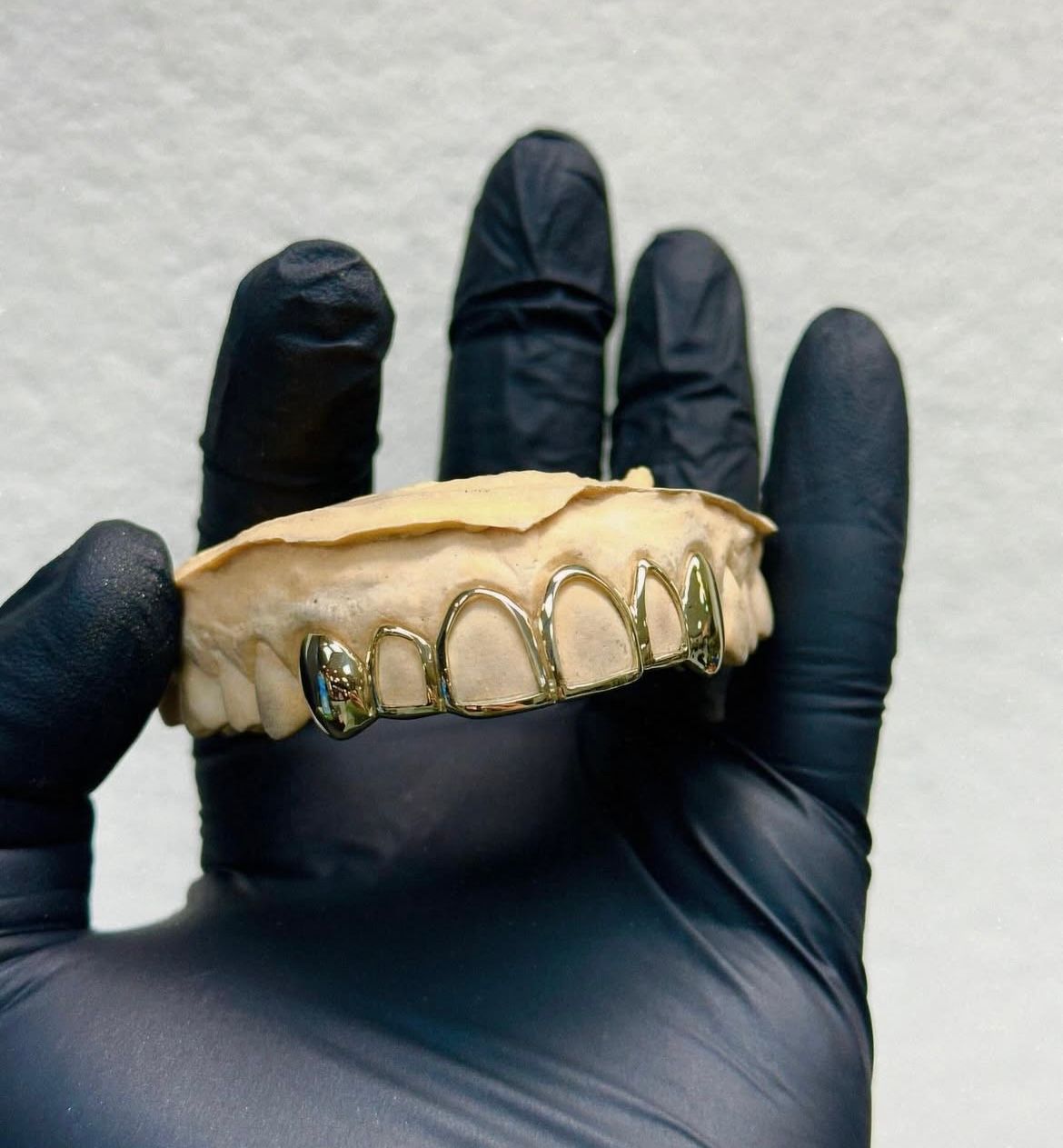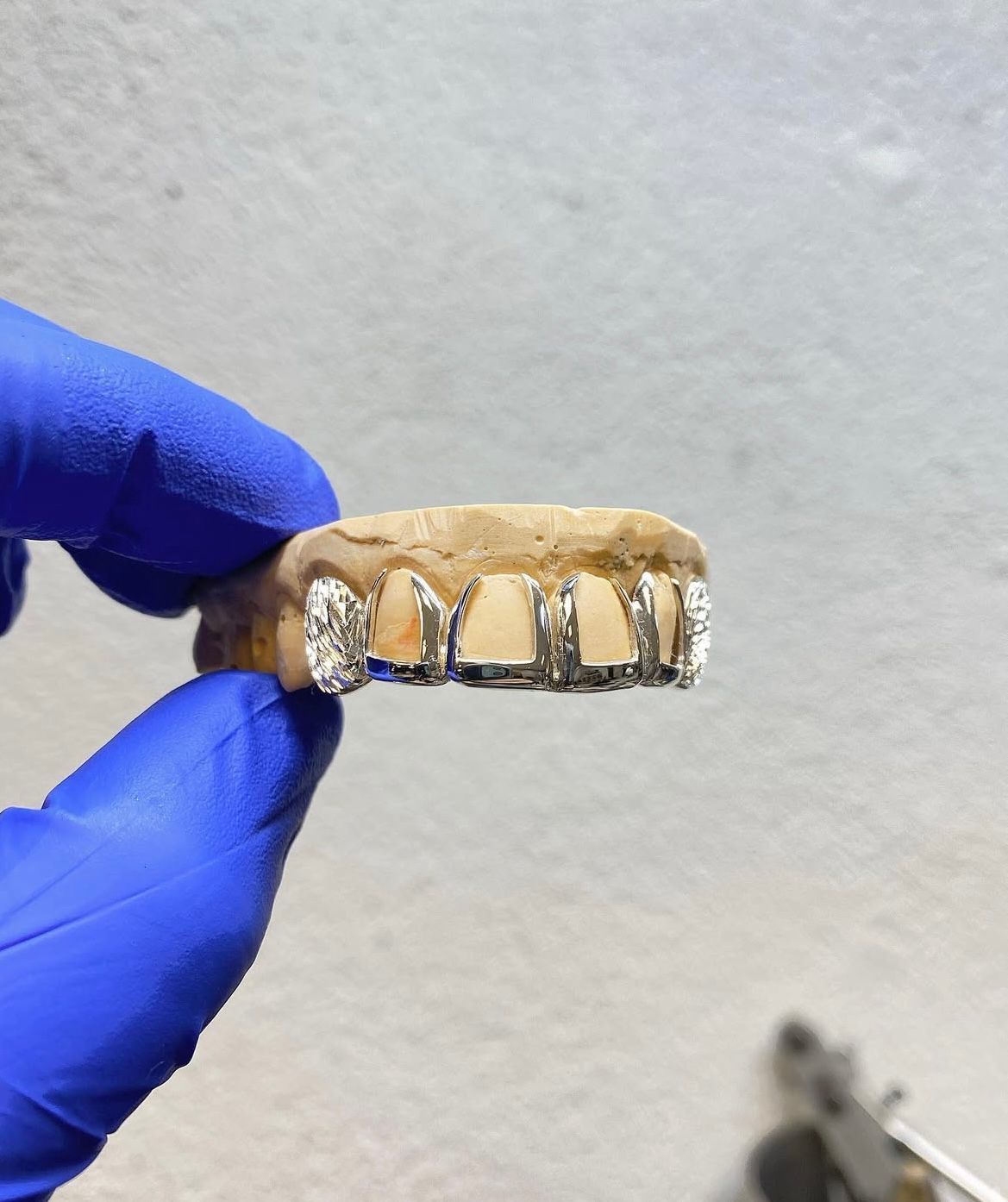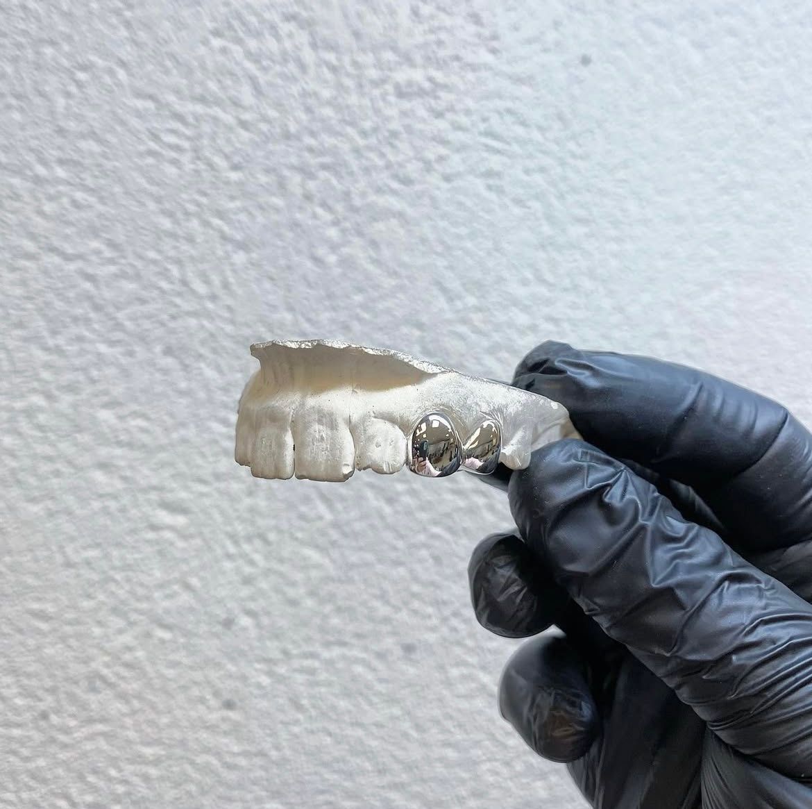 Grillz zijn aan eensluitende tanden, dus bijvoorbeeld 2 tanden naast elkaar die verbonden zijn of een top 12-piece.