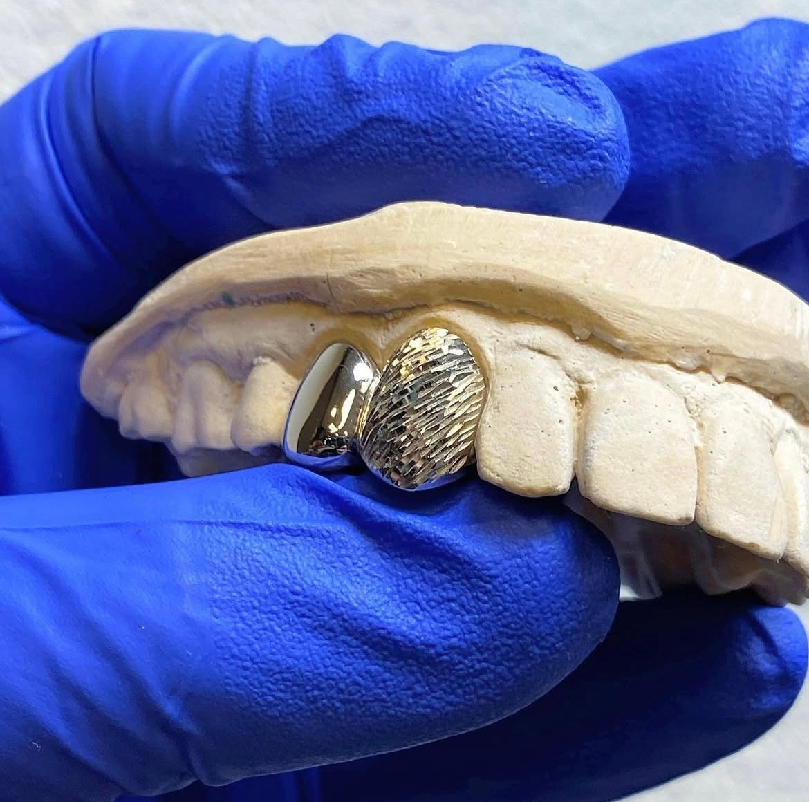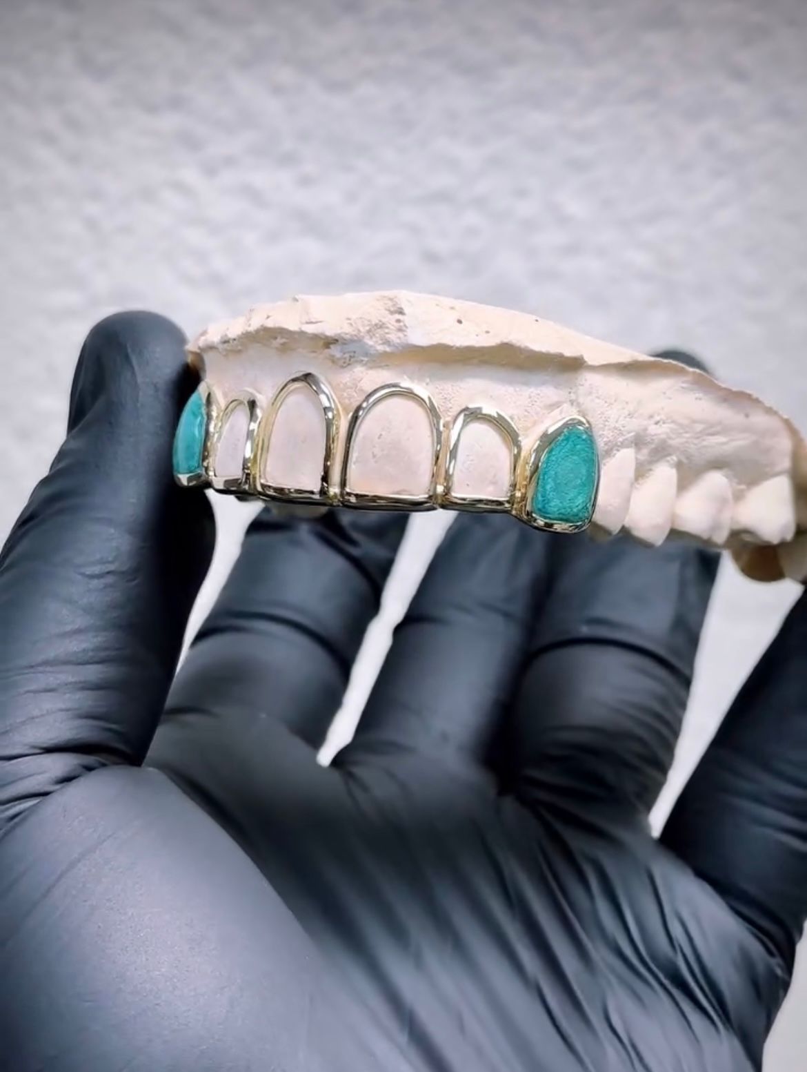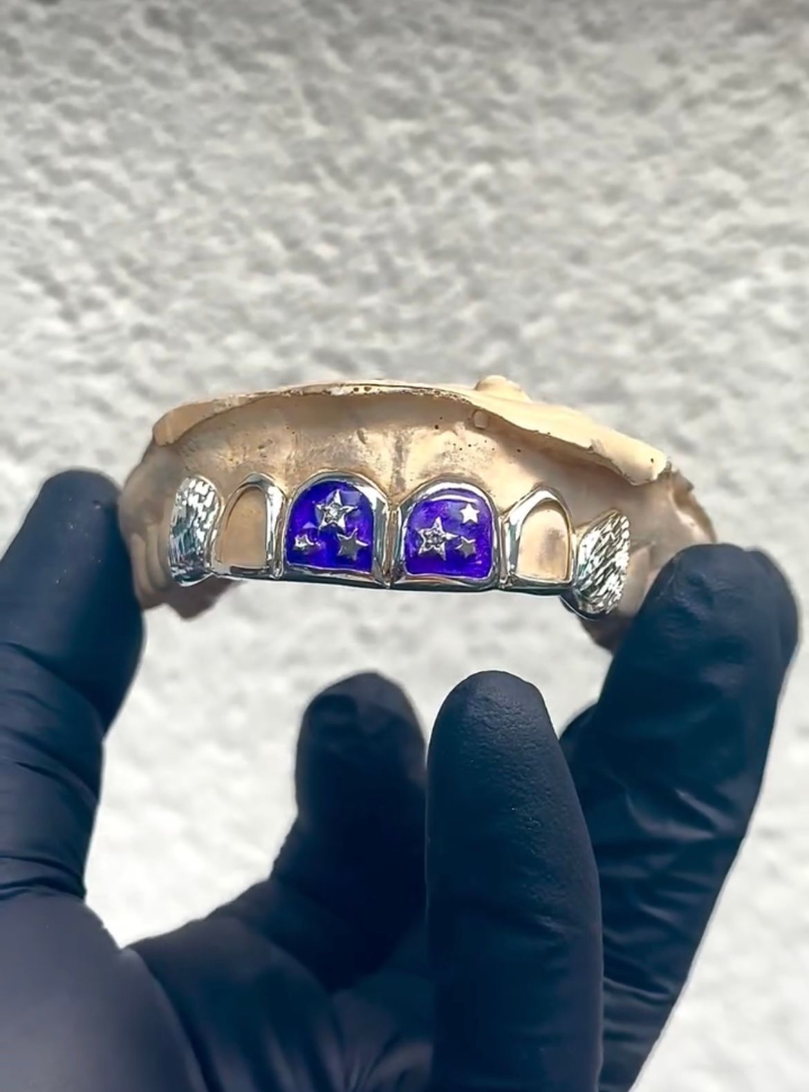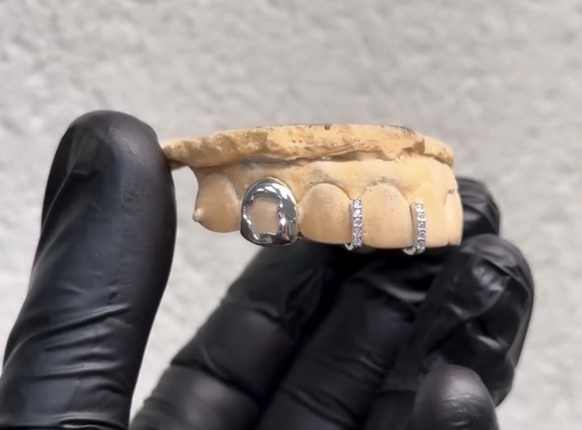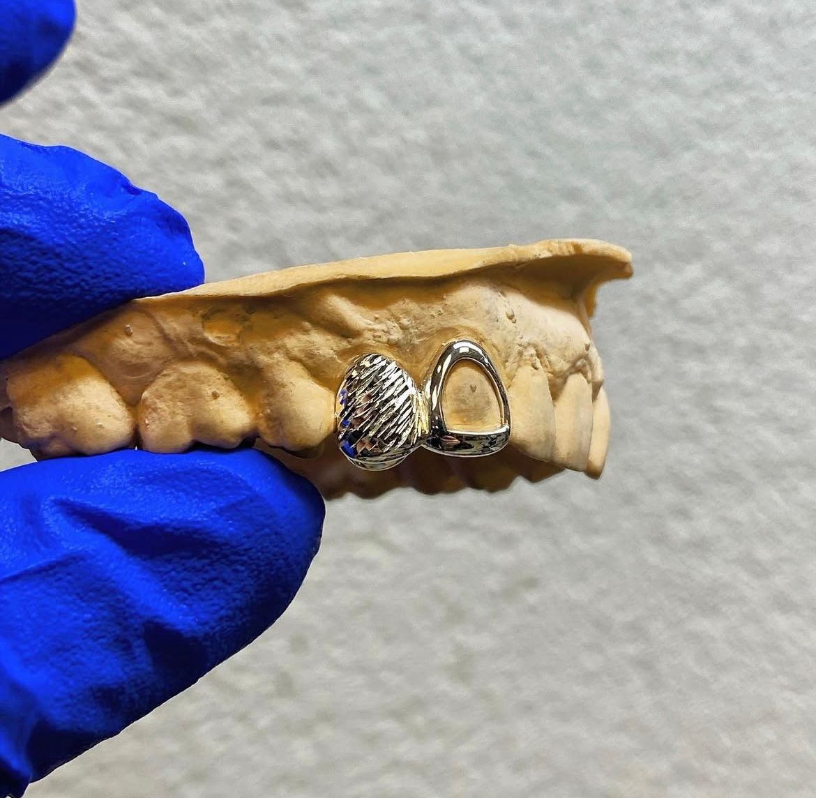 Grillz zijn aan eensluitende tanden, dus bijvoorbeeld 2 tanden naast elkaar die verbonden zijn of een top 12-piece.