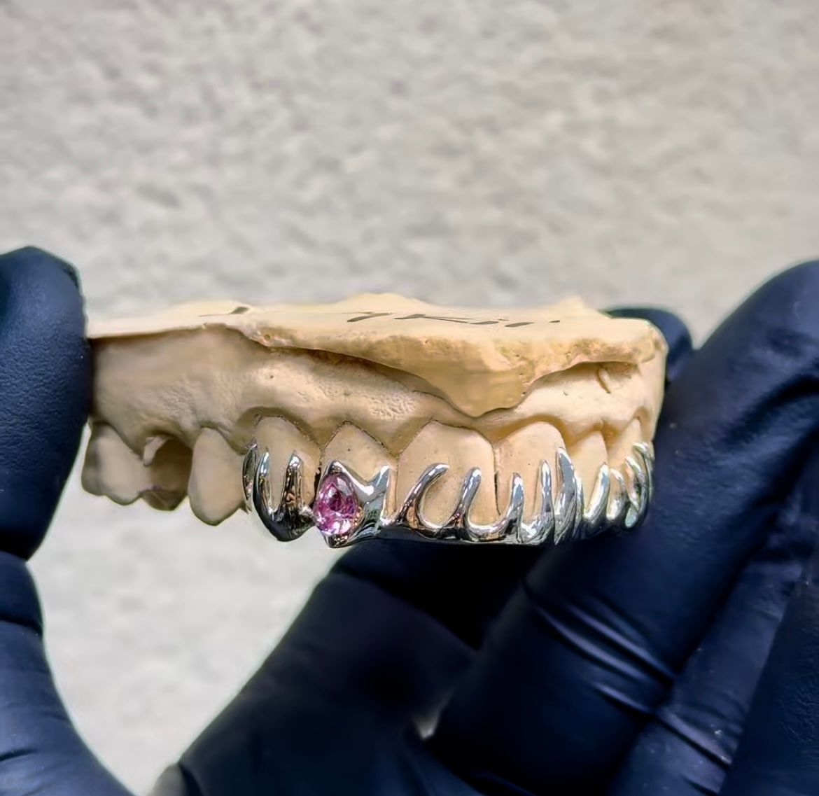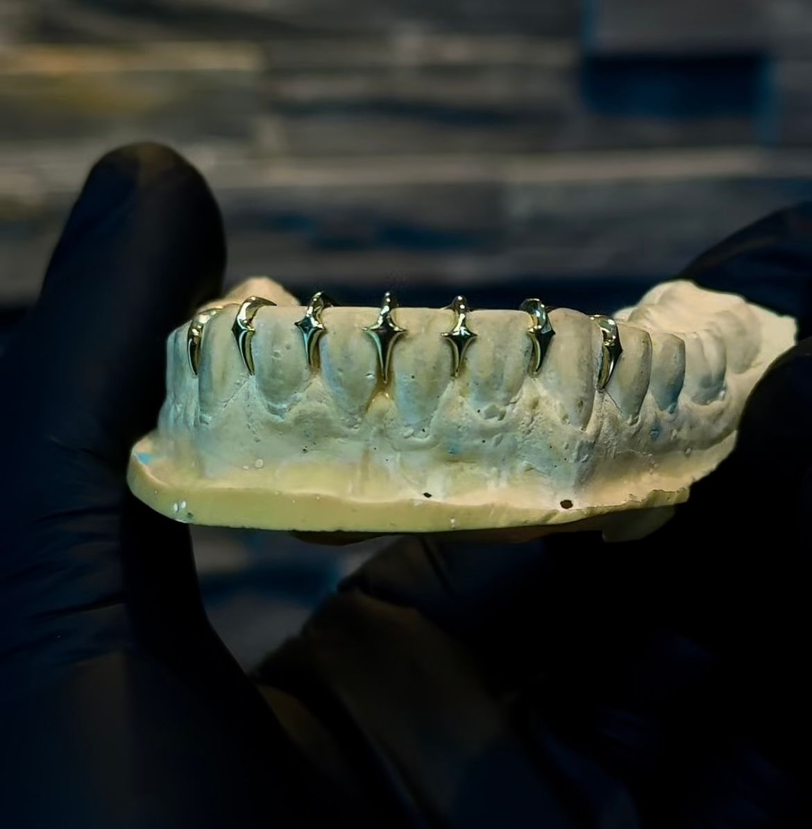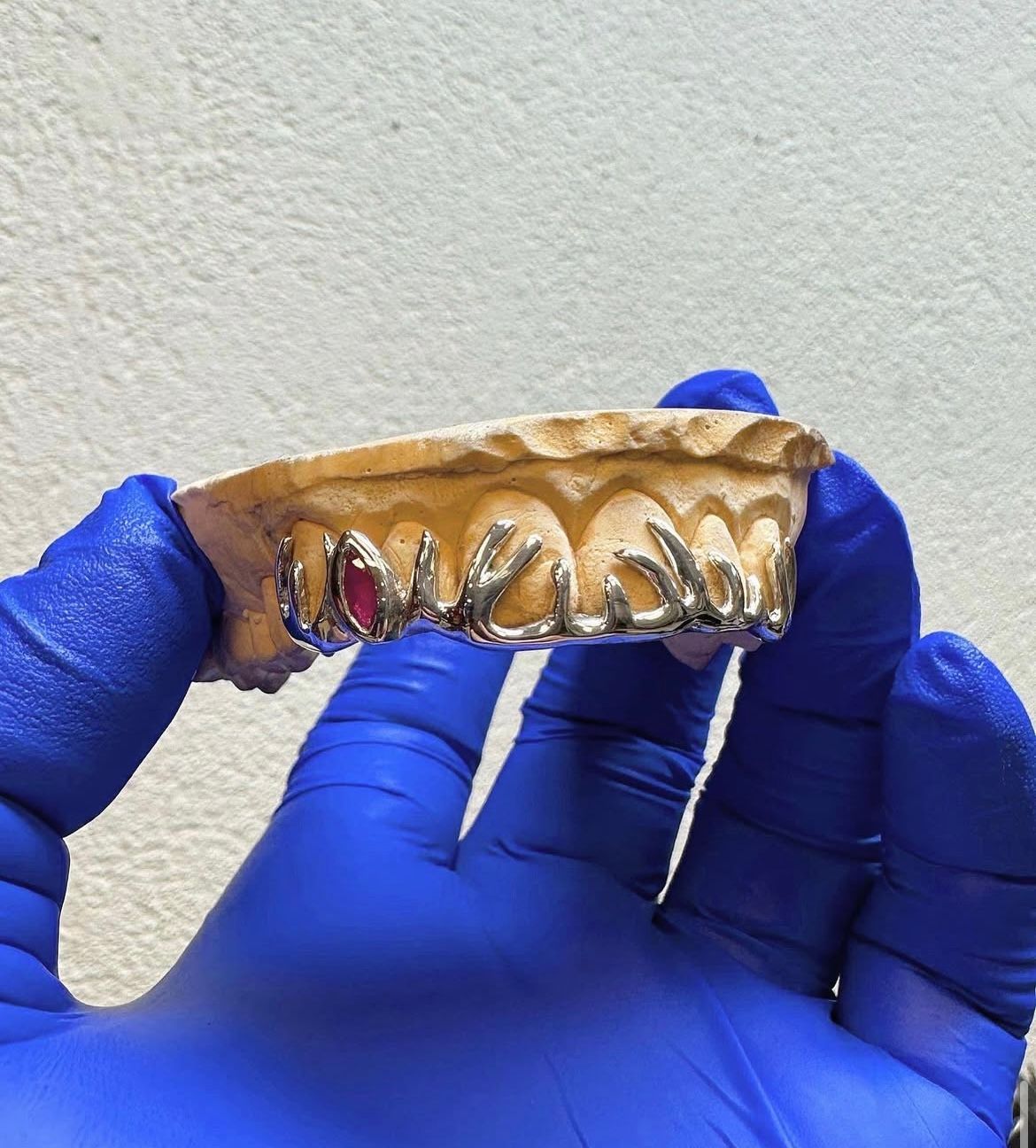 Het is bij ons ook mogelijk om custom grillz op maat te laten maken. Hiervoor wordt er eerst in de winkel een afdruk van je gebit gemaakt, waarna er volgens eigen ontwerp een wasmodel wordt gemaakt. Deze kan in diverse metalen gegoten worden, daarnaast heb je de mogelijkheid om stenen en hars toe te laten voegen. Kijk op @armanyjeweller voor de meest recente ontwerpen. De actuele prijslijst staat onderaan de pagina. Neem gerust contact met ons op om alle mogelijkheden te bespreken.